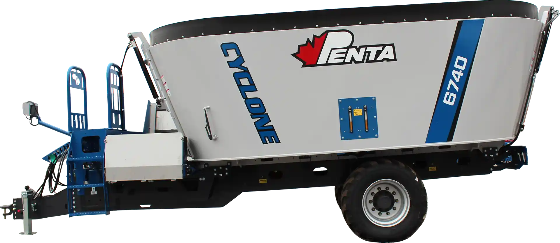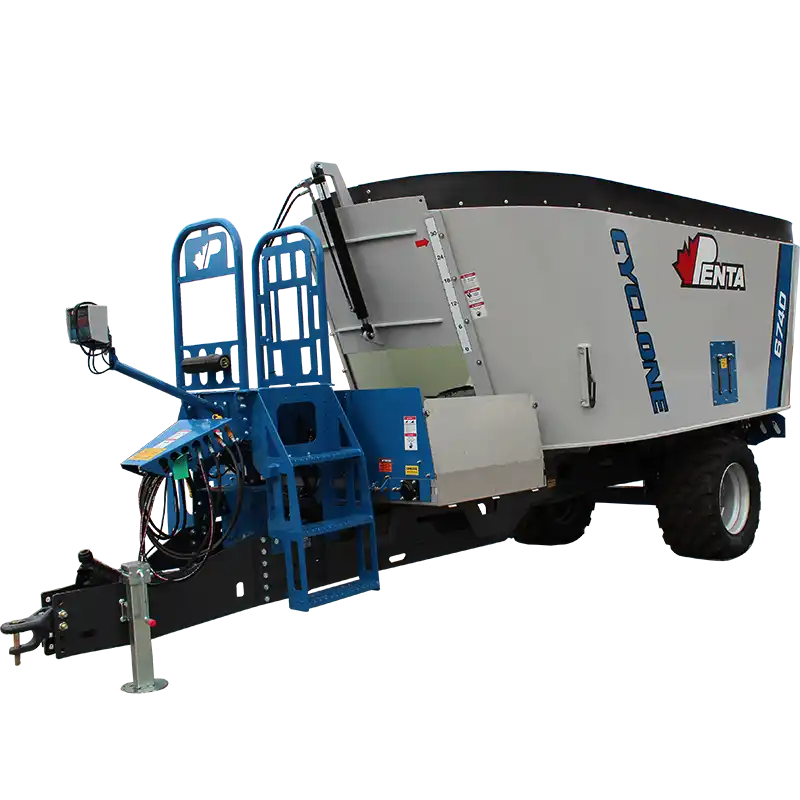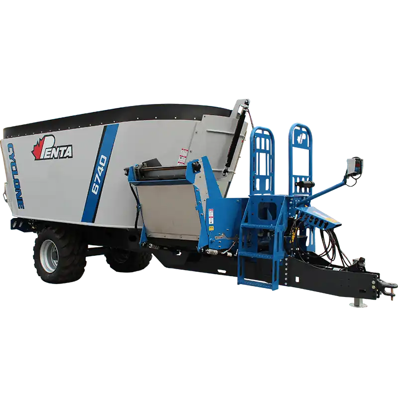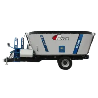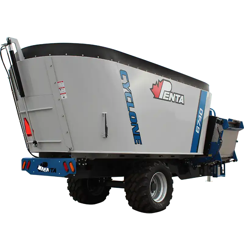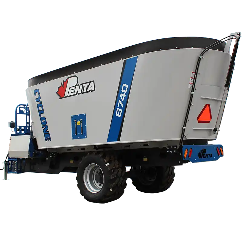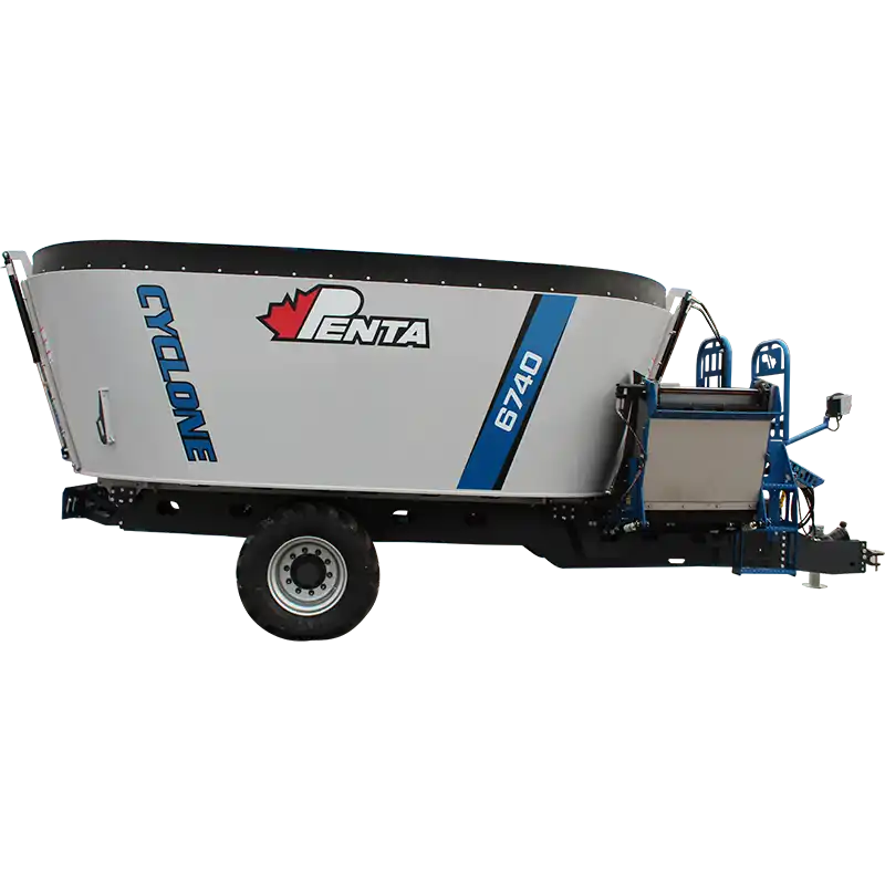 The Penta 6740 is a heavy-duty single-auger trailer mixer built for larger operations. It boasts up to 719 cu ft capacity, rugged construction, and the patented Cyclone Auger, which delivers fast, consistent mixing day in and day out.