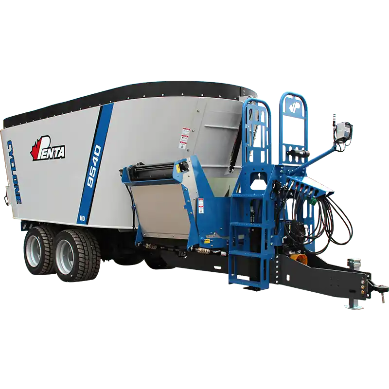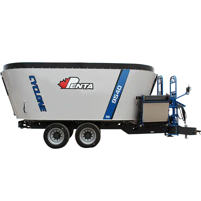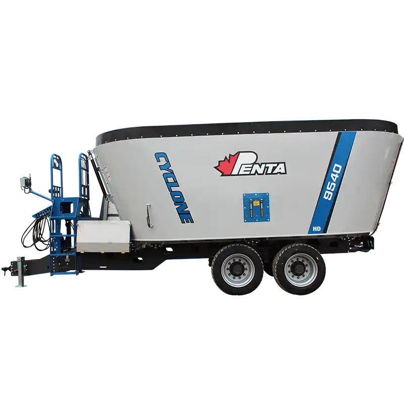 The Penta 9540 is a heavy-duty single-auger trailer mixer built for larger operations. It boasts up to 1047 cu ft capacity, rugged construction, and the patented Cyclone Augers, which delivers fast, consistent mixing day in and day out.